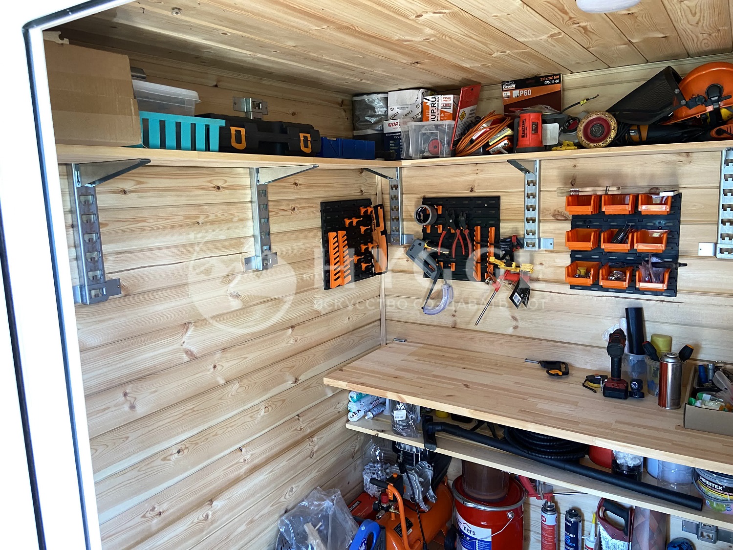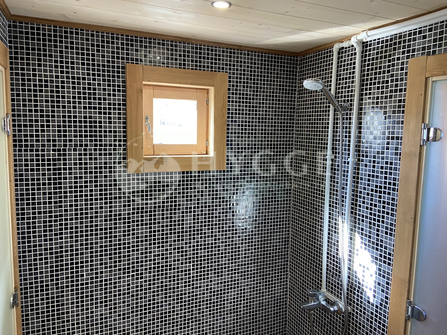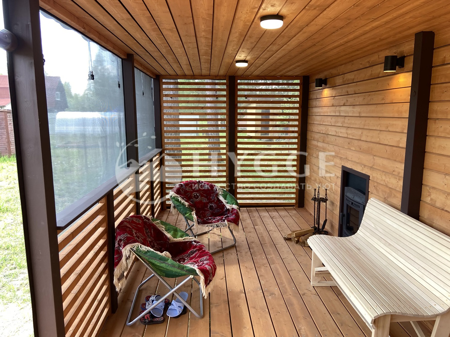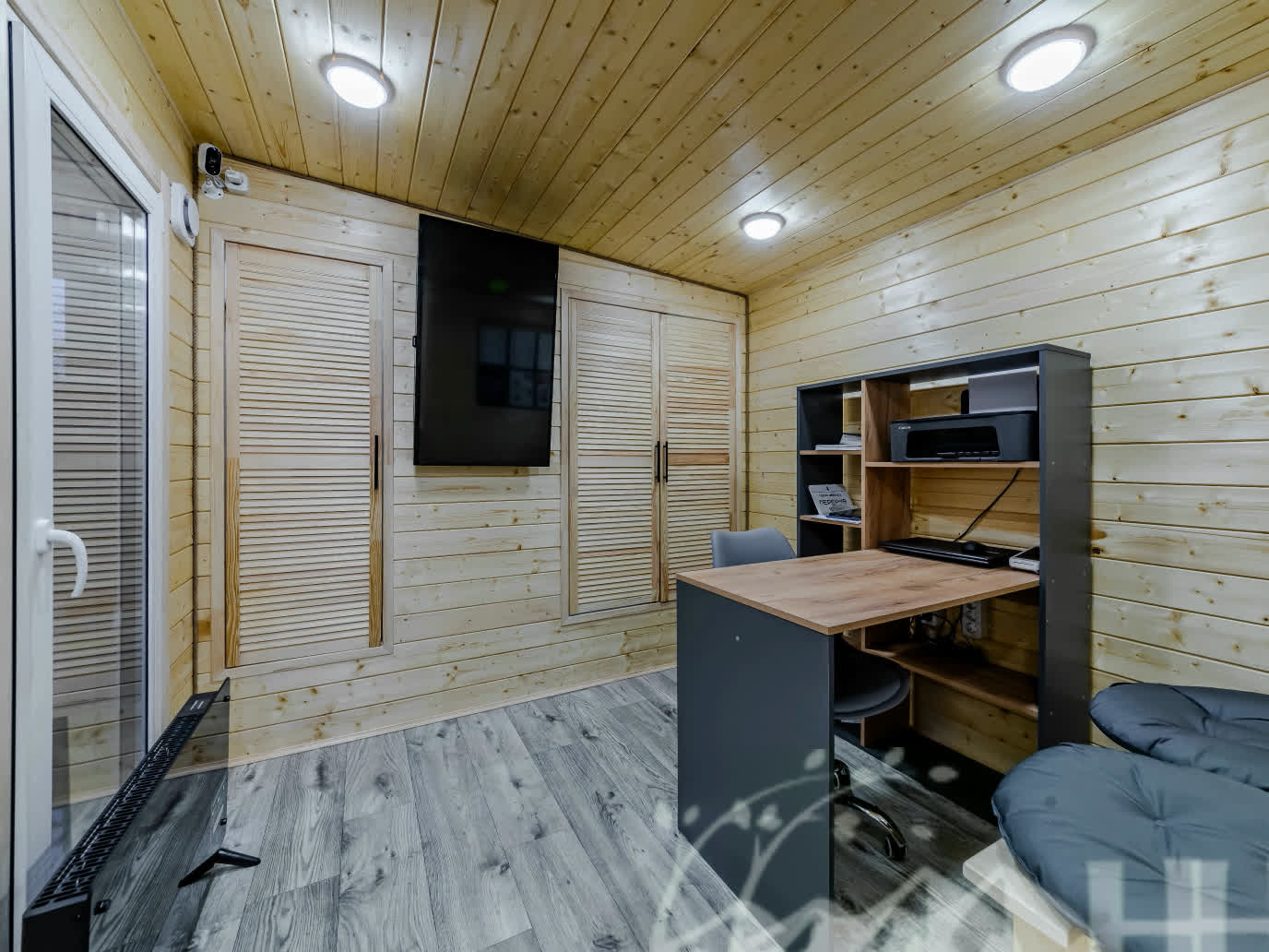 Комната отдыха и душевая: стены и потолок - вагонка Хвоя сорт АБ с обработкой составами Tikkurilla.