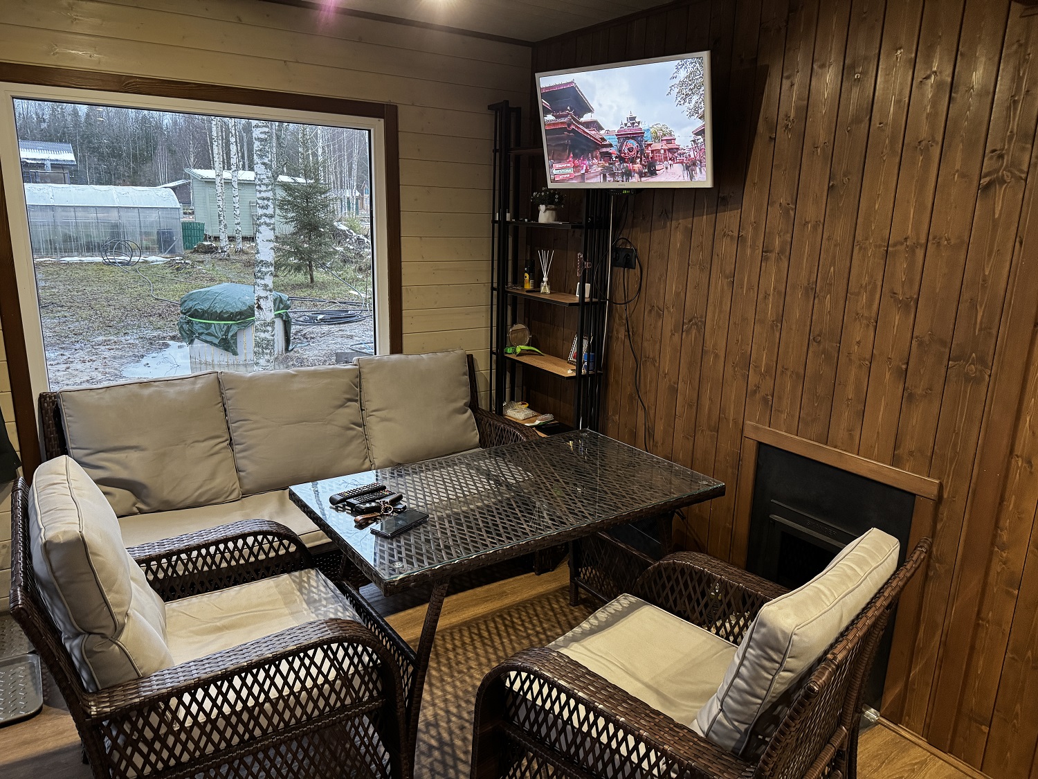 Отделка стен и потолка вагонка осина экстра класса с обработкой Tikkurilla Supi. Полки из осины сорт Экстра. Чугунная печь Сибирь-20.