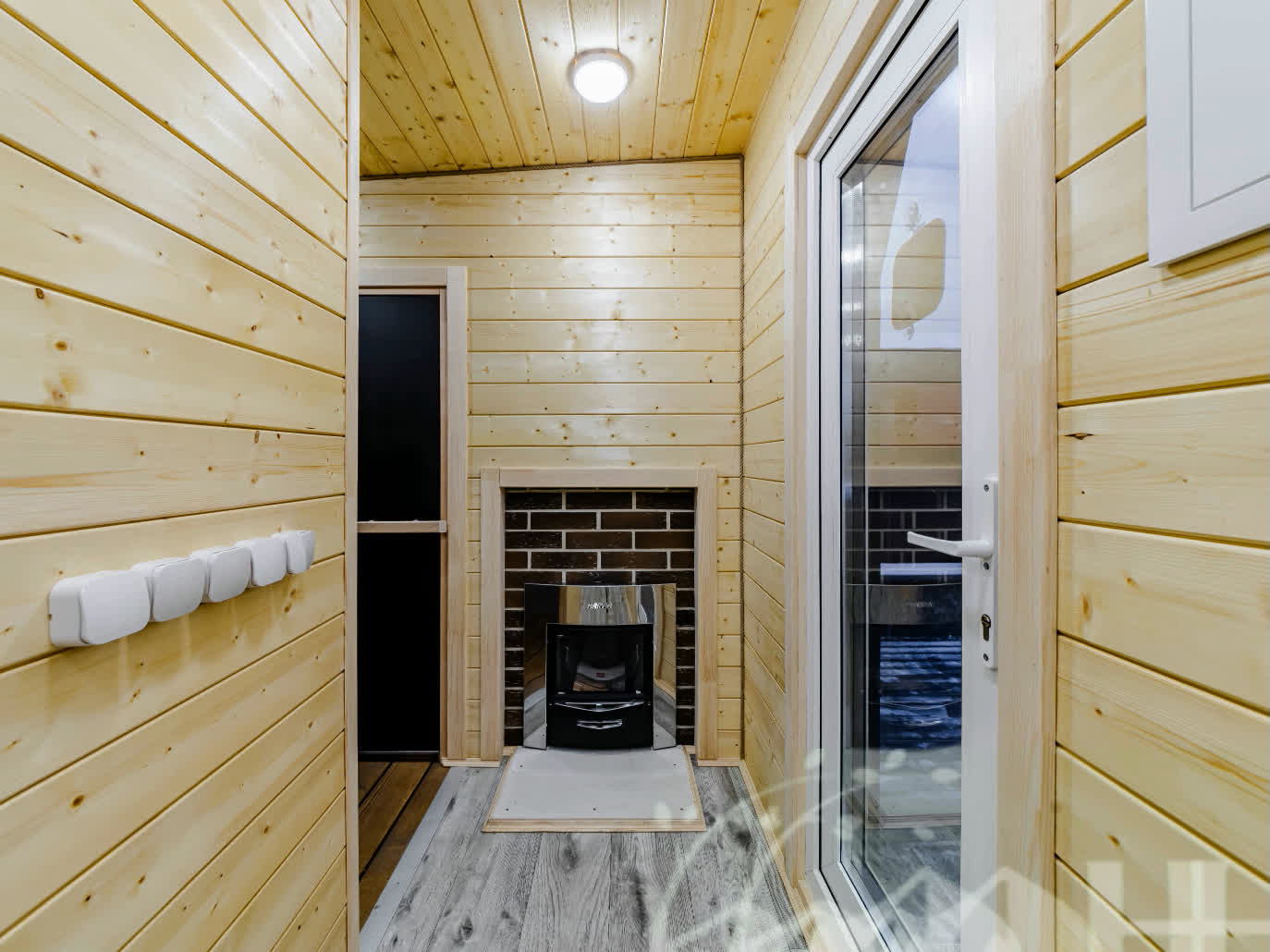 Щиток, автоматы, проводка - скрытая способом, точки розеток и освещение согласно. Настенные светильники в комнате отдыха, потолочные светильники в комнате отдыха и душевой. Под полками в парной. Уличныее фасадные светильники.
